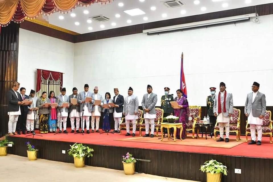 नेकपा एमाले, नेकपा माओवादी केन्द्र, राष्ट्रिय स्वतन्त्र पार्टी र राष्ट्रिय प्रजातन्त्र पार्टीबाट मन्त्री भएकाहरुले राष्ट्रपति कार्यालयमा पद तथा गोपनीयताको शपथ लिएका हुन् । राष्ट्रिय प्रजात्नत्र पार्टीका अध्यक्ष राजेन्द्र लिङ्देन उपप्रधानमन्त्री तथा ऊर्जा तथा जलस्रोत मन्त्रीको शपथ लिएका छन् ।