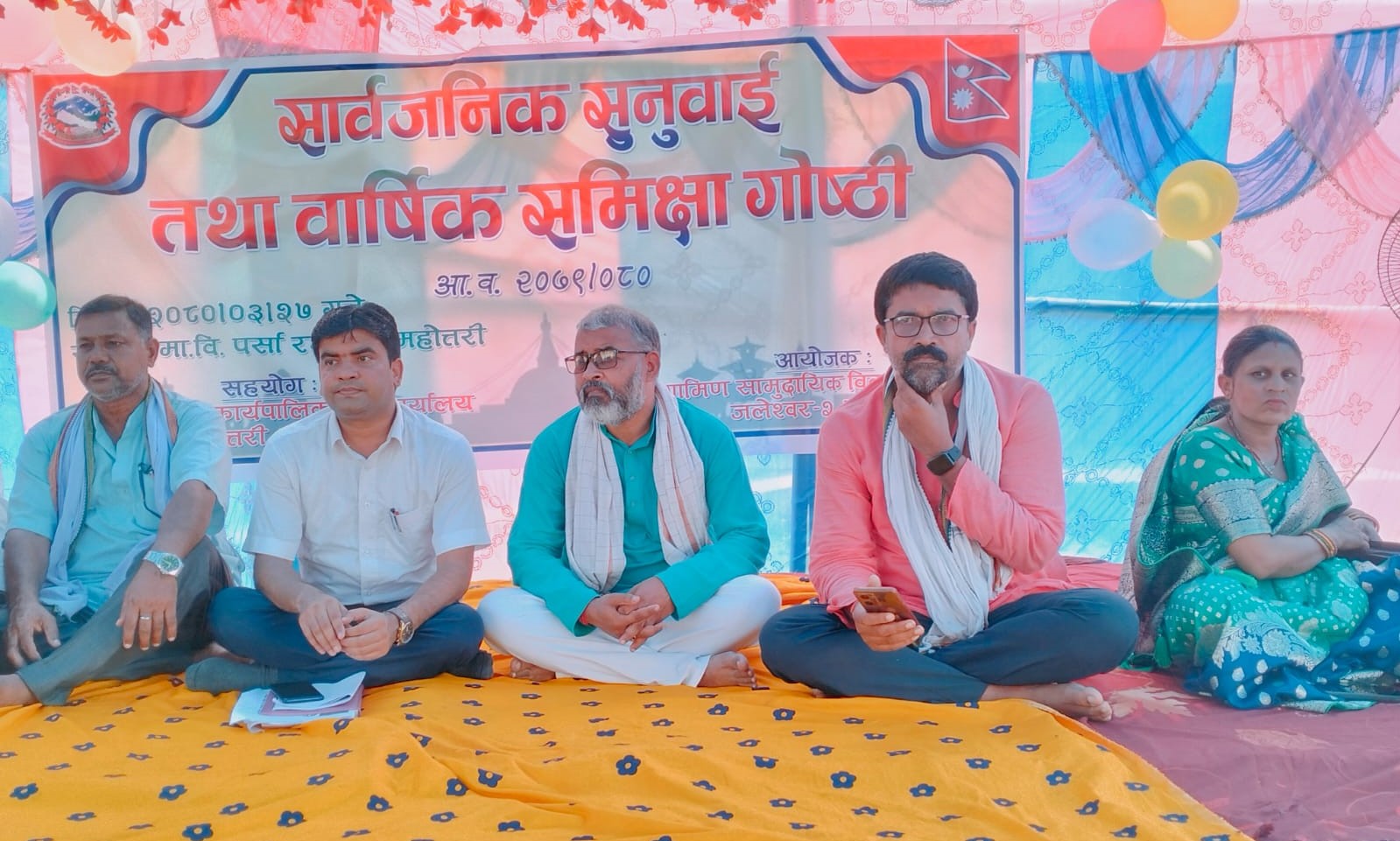 महोत्तरी गाँउपालीका वडानं.१ स्थित मा.बि पर्सा रघुनाथ बिद्यालयको प्राङ्णमा भएको सार्बजनिक सुनबाई तथा वार्षिक समिक्षा गोष्ठी गाँउपालीका अध्यक्ष दिलीप कुमार पाण्डेयको अध्यक्षतामा सम्पन्न कार्यक्रमको ग्रामिण सामुदायिक समाज जलेश्वरको आयोजन तथा सहजकिरणमा समपन्न भएको छ । उक्त कार्यक्रममा महोत्तरी गाँउपालीकाका प्रमुख प्रशासकीय अधिकृत प्रबिण कुमार झाले आ.ब. २०८९।०८० मा संचानल भएका योजना तथा आयब्यय प्रस्तुत गर्दै यहाँ स्थित बिभिन्न दल र आम नागरीकको साथ र सहयोग निरन्तर पाईरहेकोले विकासका कार्यहरु अगाडी बढीरहेको धारणा व्यक्त गरे ।