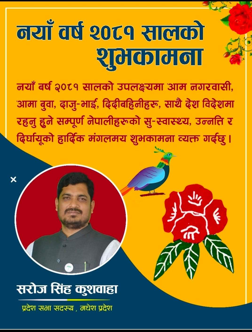 नयाँ वर्षको अवसरमा महाेतरी क्षेत्र नं४ख का प्रदेश सांसद सराेज सिंह कुश्वाहाले शुभकामना सन्देश दिँदै सबै नेपाली र इष्ट मित्रको उन्नती प्रगतिको कामना गरेका छन् ।सांसद कुश्वाहाले बितेकाे वर्षको खराब कुरालाइ बिर्सेर नायाँ वर्ष २०८१मा सबैजना मिलेर अगाडि बढने भन्दै नयाँ वर्षमा सफलता मिल्ने शुभकामना एक अर्कामा व्यक्त गरेका छन । आज नयाँ वर्ष विशेष पर्वको रुपमा मनाउने गरिन्छ । सफलता प्राप्त गर्न आजका दिन नयाँ योजना निर्माण एवम् सत्संकल्प गर्ने परम्परा समेत रहेको ले सांसद कुश्वाहाले रामगाेपालपुर नगरपालिका विश्म्भरपुरमा समुदायिक भवनकाे शिलान्यास गर्न लागेका छन । आजको दिन नयाँ कामको थालनी गर्ने परम्परा पनि रहेको छ ।