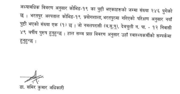 स्वास्थ्य तथा जनसंख्या मन्त्रालयका अनुसार नवलपरासी पूर्वको देवचुली नगरपालिका– १२ का ४९ वर्षीय पुरुषमा कोरोना संक्रमण पुष्टि भएको छ । चितवनको भरतपुरको प्रयोगशालामा गरिएको परीक्षणमा उनमा कोरोना संक्रमण पुष्टि भएको हो ।