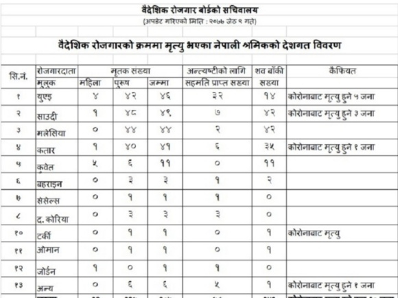 मृतक श्रमिकका ५८ परिवारले सम्बन्धित मुलुकमा नै शव अन्त्येष्टि गर्न सहमति प्रदान गरिसकेको बोर्डले जनाएको छ । विश्वभर कोरोना महामारी फैलिएसँगै खाडीका विभिन्न देश लगायत अन्य मुलुकमा वैदेशिक रोजगारका क्रममा मृत्यु भएका २०७ जनाको शवमध्ये ५८ जनाको अन्त्येष्टि सम्बन्धित देशमै गरिएपनि लकडाउनका कारण १४९ जनाको शव सम्बन्धित मुलुकमा नै अलपत्र छन् । जसमा १९५ पुरुष र १२ जना महिलाहरु रहेका छन् ।
