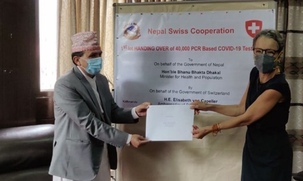 जसमध्ये २० हजार थान किट शुक्रबार स्वास्थ्यमन्त्री भानुभक्त ढकाललाई नेपालस्थित स्विस राजदूत एलिजावेथ भोन क्यापेलरले हस्तान्तरण गरेकी छन् । बाँकी २० हजार थान अगस्ट महिनामा नेपाल आइपुग्ने स्विस दूतावासले जनाएको छ ।