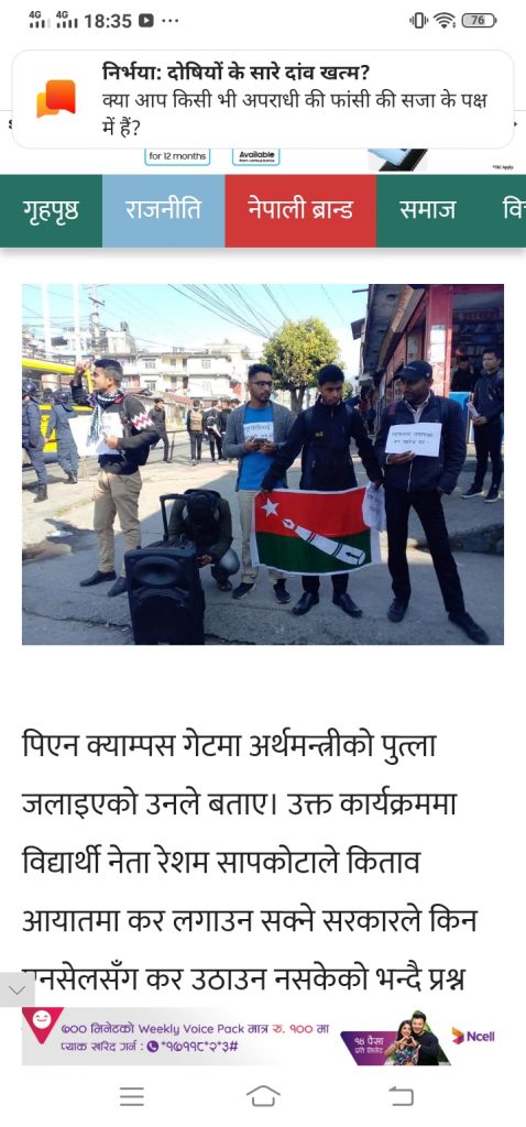 पिएन क्याम्पस गेटमा अर्थमन्त्रीको पुत्ला जलाइएको उनले बताए। उक्त कार्यक्रममा विद्यार्थी नेता रेशम सापकोटाले किताव आयातमा कर लगाउन सक्ने सरकारले किन एनसेलसँग कर उठाउन नसकेको भन्दै प्रश्न गरेका थिए। पुत्ला जलाउँदै विद्यार्थीले प्रधानमन्त्री केपी शर्मा ओलीविरूद्ध पनि नाराबाजी गरेका थिए। भ्रष्टचारीलाई प्रधानमन्त्रीले नै संरक्षण गरेको आरोप विद्यार्थीको ले लगाएकाे छ।
