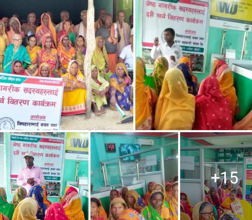 महोत्तरी जिल्लाको औरही नगरपालिका वडा नम्बर ७ मा रहेको संस्थाले नगरपालिकाकाे विभिन्न वडामा रहेकाे जम्मा ४३ जना जेष्ठ सदस्यहरुलाई रु ५०० का दरले जम्मा रू २१५००।- एकइ हजार पाँच सय दसै खर्च दिएका छन्।