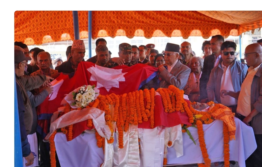 ३ मंसिर, काठमाडौं । प्रधानमन्त्री केपी शर्मा ओलीले दिवंगत पूर्वसभामुख दमननाथ ढुंगानाप्रति श्रद्धाञ्जली अर्पण गरेका छन् । उनले ढुंगानाको पार्थिव शरीरमा राष्ट्रिय झन्डा ओढाउँदै श्रद्धाञ्जली अर्पण गरेका हुन् ।