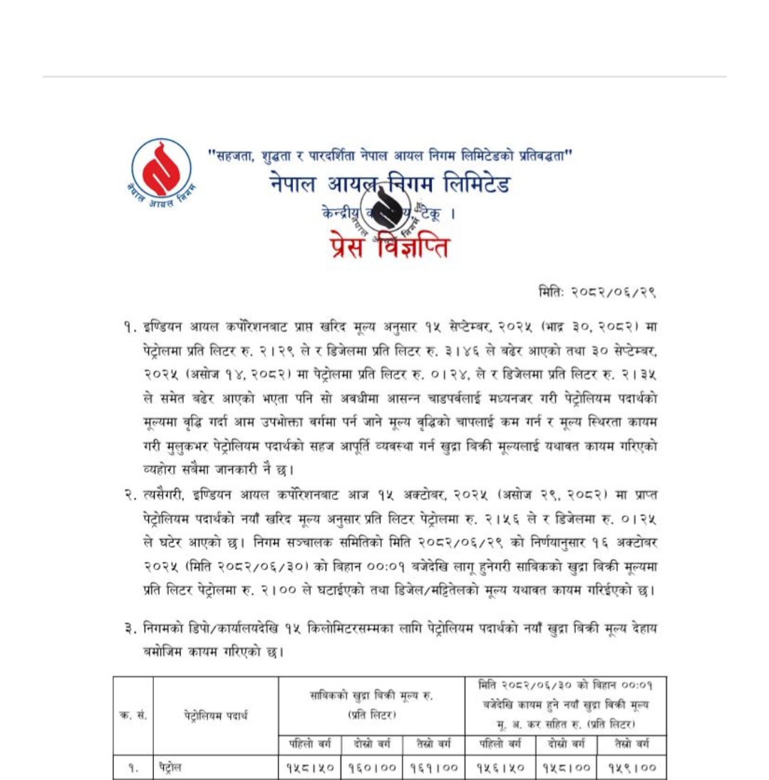 • डिजेल र मट्टीतेलको मूल्य यथावत राखिएको निगमले जनाएको छ।
