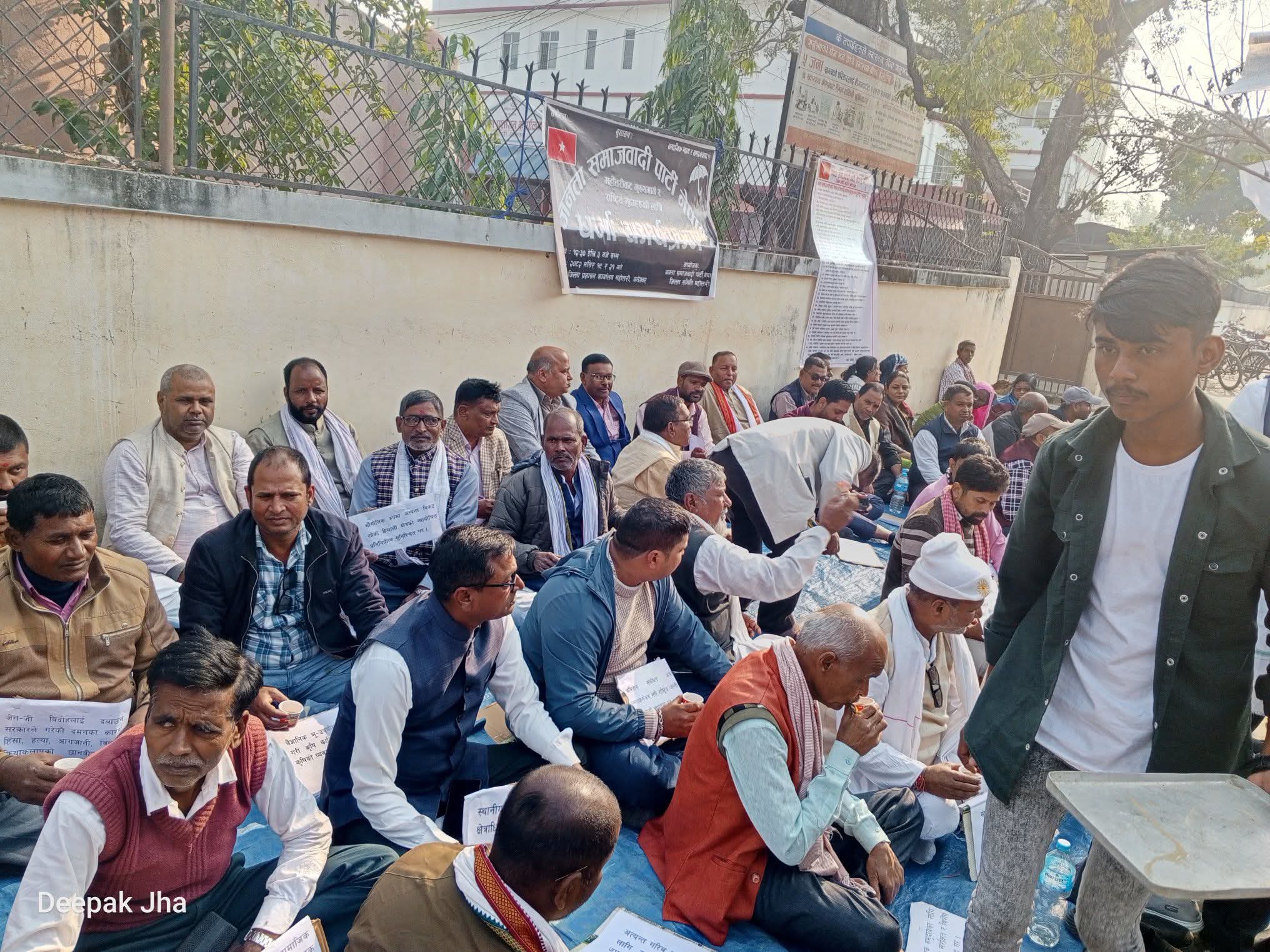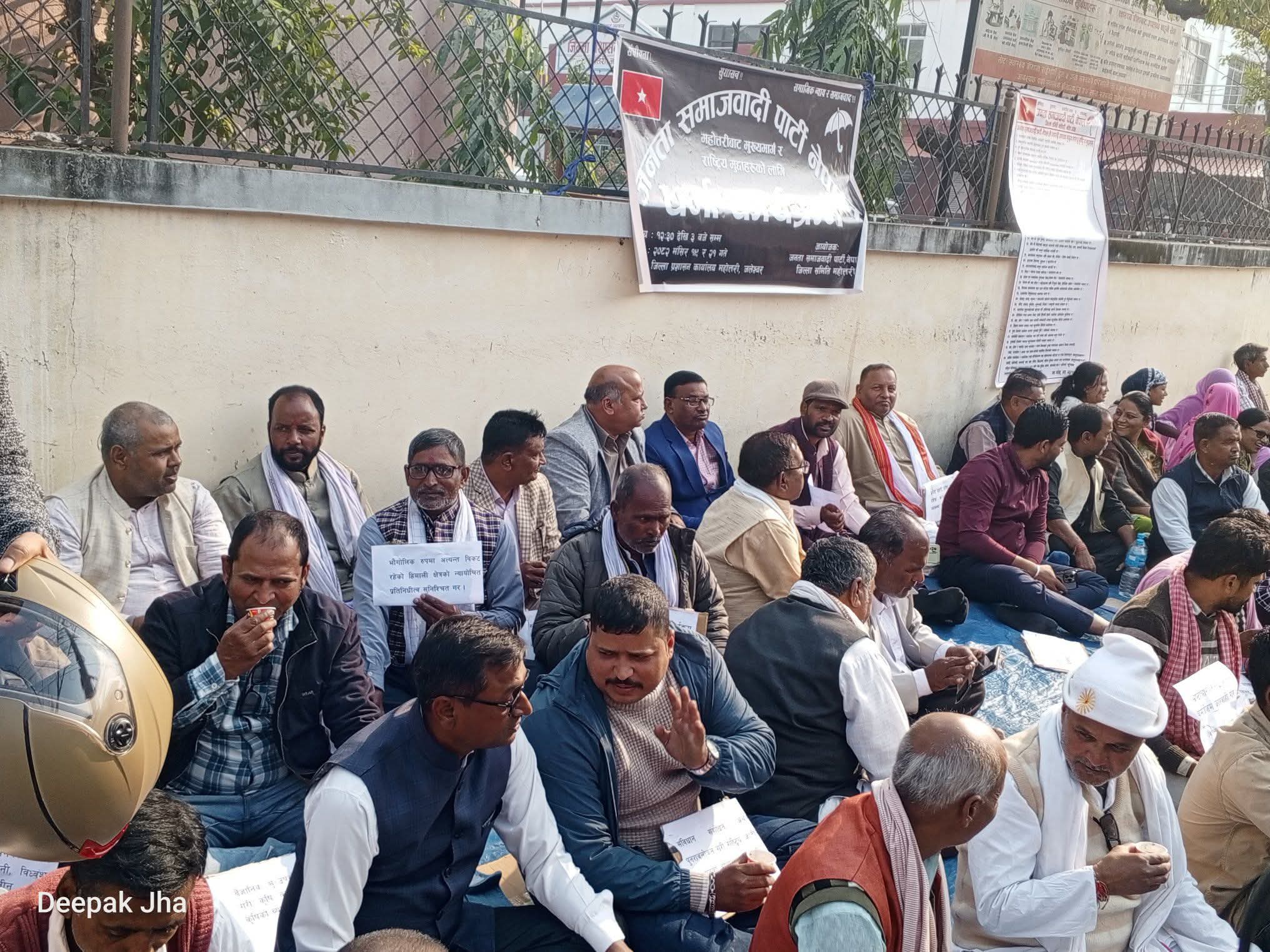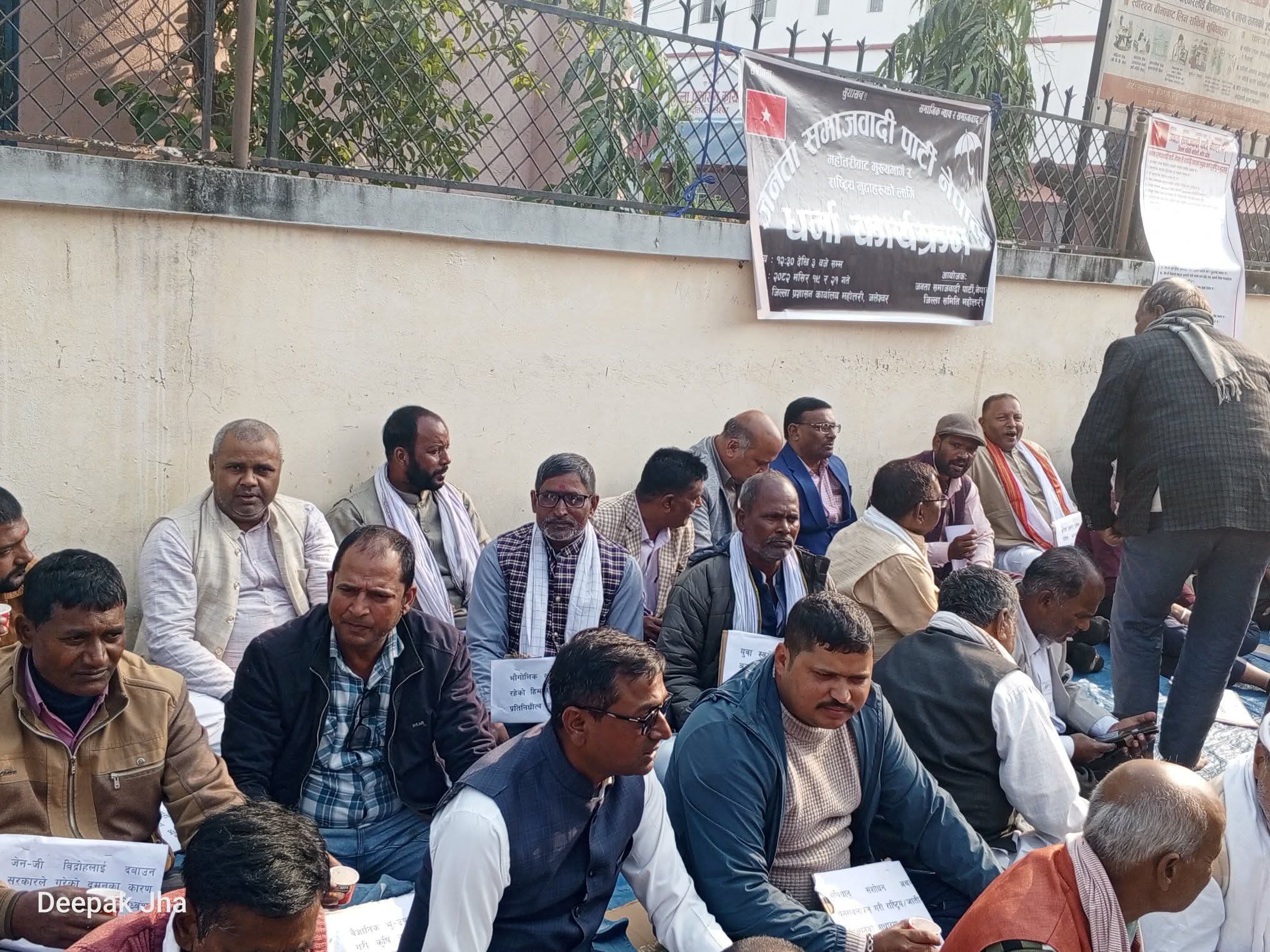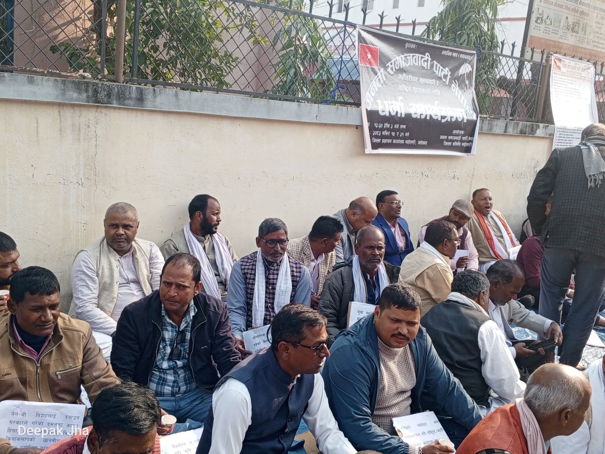 जलेश्वर । जनता समाजवादी पार्टी(जसपा) नेपालले आफ्ना २८ बुँदे मागहरूलाई सम्बोधन गर्नका लागि सरकारलाई दबाब दिन महाेत्तरी जिल्ला प्रशासन कार्यालय अगाडि शान्तिपूर्ण धर्ना तथा विरोध प्रदर्शन गरेको छ ।