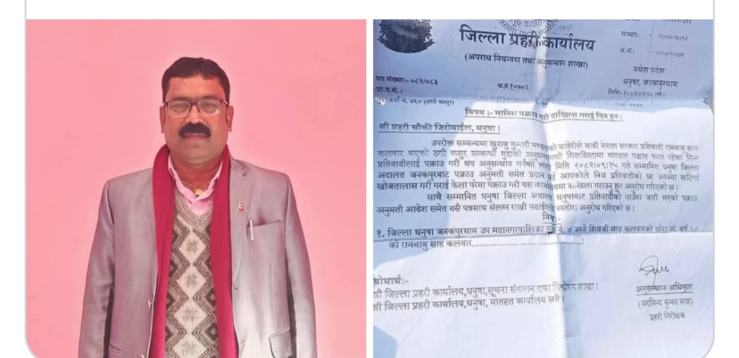 जिल्ला अदालत धनुषाले पुस २५ गते नै ठगी मुद्दामा निज व्यक्ति फरार रहेको भनी पक्राउ गरी अदालतमा बुझाउन पत्राचार गरेको थियो । सोही पत्रको आधारमा पुस २८ गते जिप्रका धनुषाले जिरोमाईल प्रहरी चौकीलाई पत्राचार गरेको थियो । जिरोमाइल प्रहरी चौकीले उनलाई पक्राउ गरी उपस्थित गराउन पत्राचार गरेको थियो ।