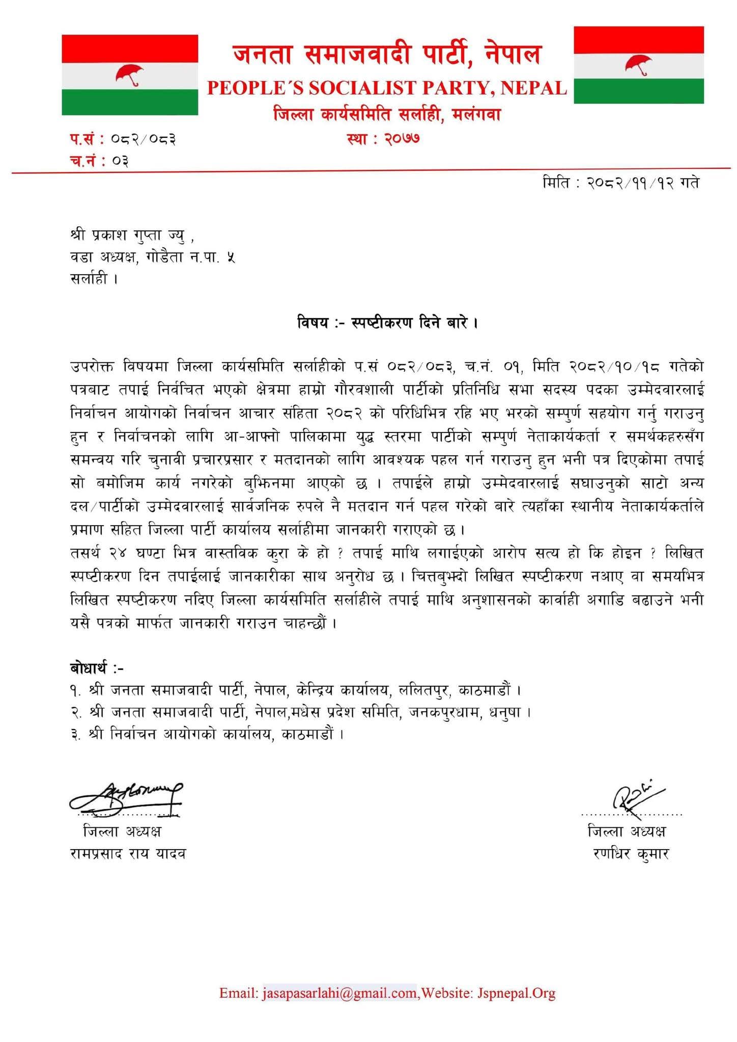 सर्लाही, फागुन — जनता समाजवादी पार्टी, नेपाल (जसपा नेपाल) जिल्ला कार्यसमिति सर्लाहीले प्रतिनिधि सभा सदस्य पदको निर्वाचनमा पार्टीका आधिकारिक उम्मेदवारलाई असहयोग गरेको आरोपमा स्थानीय तहमा निर्वाचित पाँच जना जनप्रतिनिधिसँग २४ घण्टे लिखित स्पष्टीकरण माग गरेको छ।