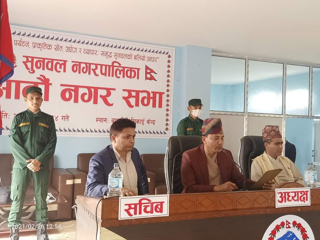 कृषि, पर्यटन , प्राकृतिक स्रोत, उद्योग र ब्यापार, समृद्ध सुनवलको बलियो आधार भन्ने मुल नाराका साथ पश्चिम नवलपरासीको सुनवल नगरपालिकाको आठौ नगर सभा आज शुक्रबार एक कार्यक्रमका बिच सुनवलमा सम्पन्न भएको छ । सुनवल नगरपालिकाका नगर प्रमुख भिमबहादुर थापा क्षेत्रीको अध्यक्षतामा आठौ नगर सभा सम्पन्न भएको हो । कार्यक्रममा आर्थिक बर्ष २०७७।७८ को बजेट तथा कार्यक्रम संशोधन प्रस्ताव प्रस्तुत गर्दै नगर उपप्रमुख दधिराम अर्यालले आर्थिक बर्ष २०७७ ।७८को पारित बजेट ८५ करोड ,४ लाख, ३३ हजार नौ सय ६४ रुपैयाबाट आकार बृद्धि गरी ९२ करोड, ६६ लाख , ७८ हजार चार सय २० रुपैया बनाइएको बताउनु भएको छ । उहाले आन्तरीक आय तर्फ नदीपदार्थको ठेक्का रकम तर्फ २७ दशमलव ९८ प्रतिशत प्रगति भएको बताउदै चालु खर्च तर्फ ३५.८५प्रतिशत , पुजीगत खर्च तर्फ २१.०६ प्रतिशत प्रगति भएको जानकारी दिनु भएको छ । उपप्रमुख अर्यालले पुजीगत खर्च तर्फका योजना तथा कार्यक्रमहरु संचालनका लागी उपभोत्ता समिती गठन भइ अधिकांश योजना तथा कार्यक्रमहरु संचालन भइरहेको बताउनु भएको छ । कार्यक्रममा बोल्दै उपप्रमुख अर्यालले सुनवल नगरपालिका दुग्ध पर्दाथ र मासुमा आत्म निर्भर भइसकेको र अन्नबालीमा पनि लगभग आत्मनिर्भर भएको हुदा दुध र मासु उत्पादनको पकेट क्षेत्रको रुपमा सुनवललाइ बिकास गर्नुपर्नेमा जोड दिनु भएको छ । उपप्रमुख अर्यालले ९५ प्रतिशत योजना सम्झौता भई सम्पन्न भईसकेको जानकारी गराउदै नगरपालिकाले ४ बर्षको बजेट बनाउदा धेरै उपलब्धी हासिल गरेको समेत बताउनुभएको छ । नगरका १३ वटै वडामा स्वास्थ्य केन्द्र स्थापना , ४ बर्षको अवधिमा ५८ किमि सडक कालोपत्रे गरेको उहाले जानकारी दिनुभयो । नगर उपप्रमुख अर्यालले सुनवल शिक्षामा लुम्बिनी प्रदेशमै १ नंम्बरमा परेको, न्यायिक क्षेत्रमा पनि नवलपरासीका ७ वटै स्थानिय तहहरु मध्ये सुनवल नगरपालिकाको न्यायिक समिति उत्कृष्ठ रहेको बताउनु भयो उहाले नगरका १३ वटै वडामा महिलाहरु सिप सिकि उद्यमी भएको बताउदै यदि नगरपालिकाले थप उद्योग स्थापना गरेमा यहाका महिलाहरु समेत उद्यमी भइ अघि बढन सक्ने बताउनुभयो । आठौ नगर सभामा सुनवल नगरपालिकाका विभिन्न विधेयकहरु पेश गरिएको थियो । सभामा नगरपालिकाको सार्वजनिक नीजि साझेदारी विधेयक, अटोभिलेज व्यवस्थापन विधेयक, कर्मचारी कल्याणकोष संचालन विधेयक, खानेपानी तथा सरसफाई उपभोक्ता समिति व्यवस्थापन विधेयक र औधोगिक ग्राम संचालन तथा व्यवस्थापन विधेयक पेश गरिएको थियो । विधायन समितिका संयोजक दुर्गा कोईरालाबाट सभा समक्ष ति विधेयक पेश गर्नुभएको हो । सो अवसरमा महिला ईलम उद्यम समिति संयोजक रमा शर्मा, नदिजन्य पदार्थ उपसमिति संयोजक थमन सिंह नेपाली, आर्थिक विकास समिति संयोज