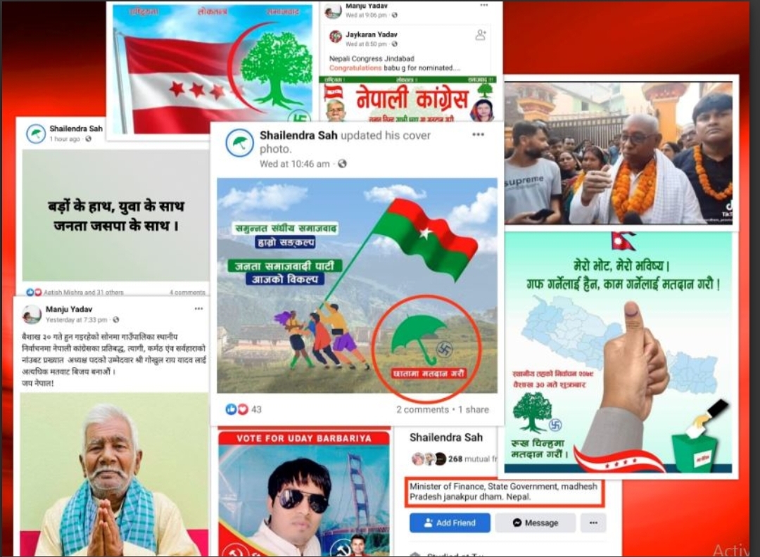 मधेस प्रदेश सरकारका एक मन्त्रीले सामाजिक सञ्जालमा जनता समाजवादी पार्टी नेपालको पक्षमा खुलेरै मत मागिरहेका छन् । प्रदेश सरकारका अर्थमन्त्री शैलेन्द्र प्रसाद साहले आफ्नो फेसबुक पेजमा जसपाको लोगोलाई नै प्रोफाइल तस्बिर बनाएका छन् भने जसपाको पक्षमा खुलेरै मत मागिरहेका छन् । उनले आफ्नो फेसबुकमा ‘छातामा मतदान गरौं’ भन्दै सार्वजनिक रुपमै मत मागिरहेका छन् ।त्यस्तै, मधेस प्रदेशकै एक सांसद मञ्जु यादवले पनि नेपाली कांग्रेसका उम्मेदवारहरुको पक्षमा खुलेरै सामाजिक सञ्जालमार्फत मत मागिरहेकी छन् । उम्मेदवारहरुको मत माग्नमा उनको फेसबुक नै भरिएको छ ।मधेस प्रदेशका मुख्यमन्त्री लालबाबु राउतका स्वकीय सचिव जितेन्द्र यादव पनि खुलेरै जसपाका उम्मेदवारको पक्षमा मत माग्नुका साथै निर्वाचन केन्द्रीत गतिविधिमा सरकारी सवारी साधनको प्रयोग गरिरहेका छन् ।