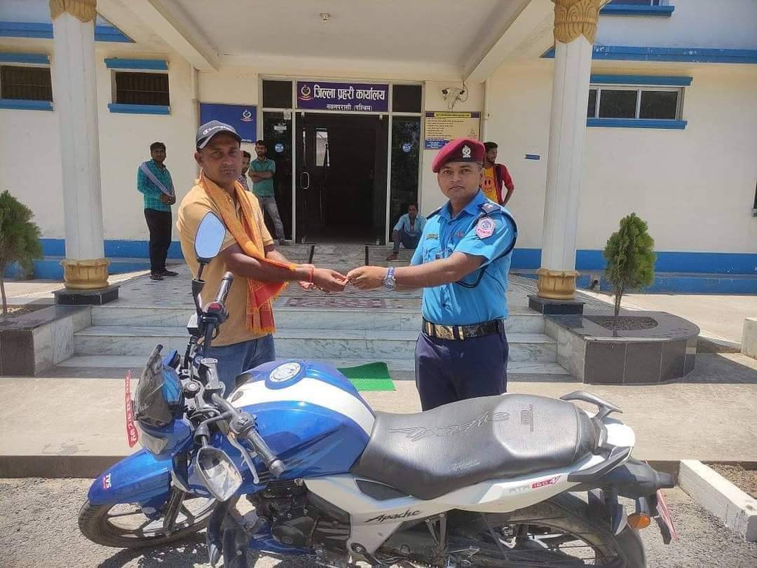 २९ गते राति जिल्लाको रामग्राम नगरपालिका वडा नं ८ बैकुण्ठपुर स्थित आफ्नै घरमा पार्किङ गरी राखेको लु ६३ प १८७५ नं को अपाची मोटरसाइकल चोरी भएको थियोे । जिल्ला प्रहरी कार्यालयलाई जानकारी भए पश्चताप खोजतलास गरि मोटरसाइकल संबंधित धनी प्रमोद गिरीलाई बुझाइएको जिल्ला प्रहरी कार्यालय नवलपरासी पश्चिमका सुचना अधिकारी प्रेम बहादुर शाहीले बताए ।