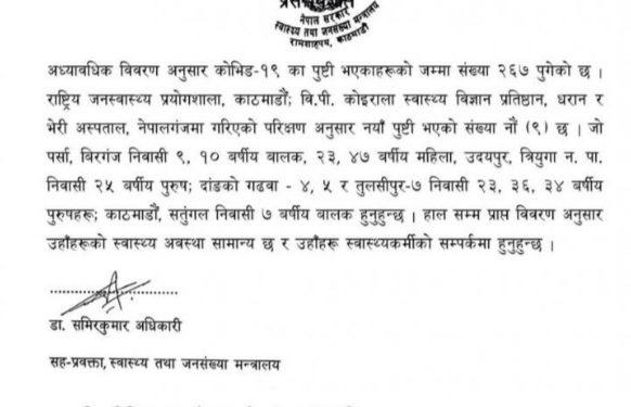 शुक्रबार साँझ थप ९ जना कोरोना संक्रमित फेला परेका छन् । यससँगै नेपालमा कोरोना संक्रमितको संख्या २ सय ६७ पुगेको छ ।